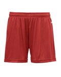 Badger B-Core 5 Women's Short. Badger heat seal logo on left hip. 100% Polyester moisture management fleece fabric. Double-needle hem. 1.5 in Elastic waistband with drawcord. 5 inseam.